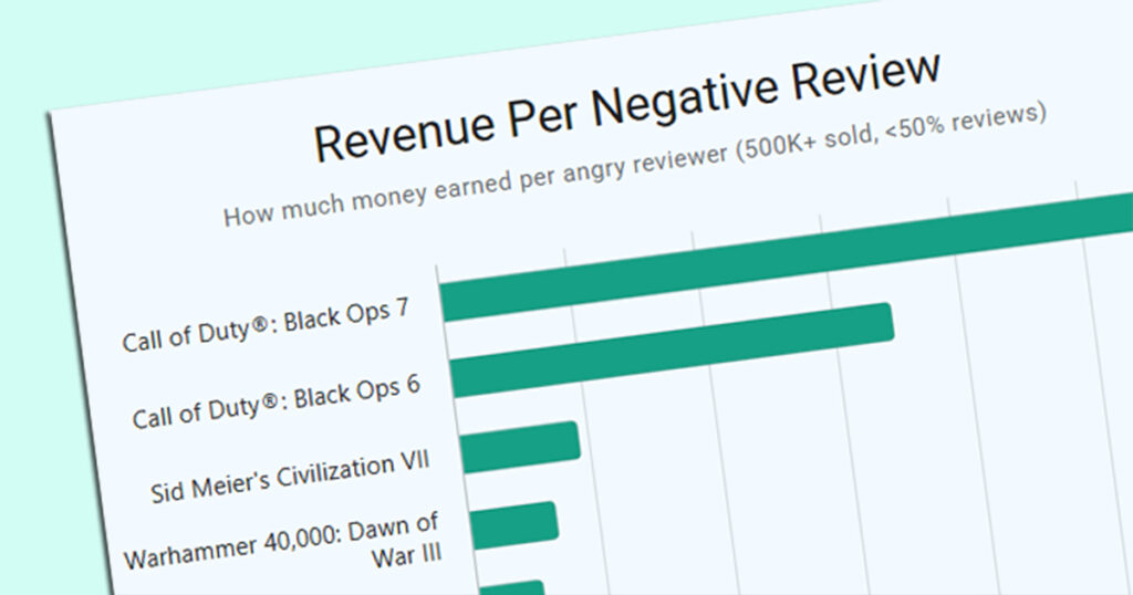 Using this, they divide the game’s estimated total revenue by its number of negative reviews. For Black Ops 7, this yields about $30,000 per negative review. Game Developer explains that the chart “measures a game’s estimated revenue against the number of negative reviews”. In plain terms: if BO7 sold, say, 5 million copies at $70 each (roughly $350M gross), and suppose 10,000 players left negative reviews, then revenue-per-negative-review ≈ $35,000. The exact figures depend on their sales estimate and review count, but the key point is it’s an approximate, analytical metric, not an official stat.