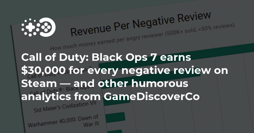 It’s a metric from GameDiscoverCo’s analysis showing that Black Ops 7’s total revenue (estimated from sales) divided by its number of negative Steam reviews is about $30K. In other words, each critical review corresponds to about $30,000 in game revenue. It highlights that a blockbuster can absorb many negative reviews and still be highly profitable. - How did GameDiscoverCo get this number?